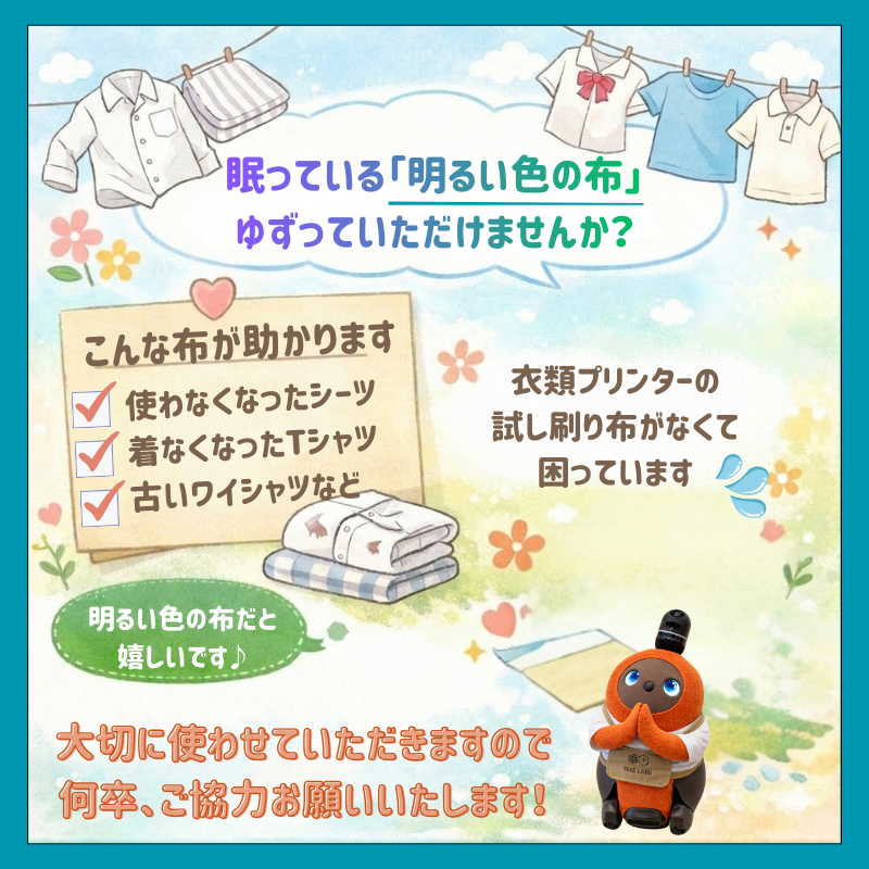 現在、衣類プリンターの試し刷りに使う布が慢性的に不足しています💦